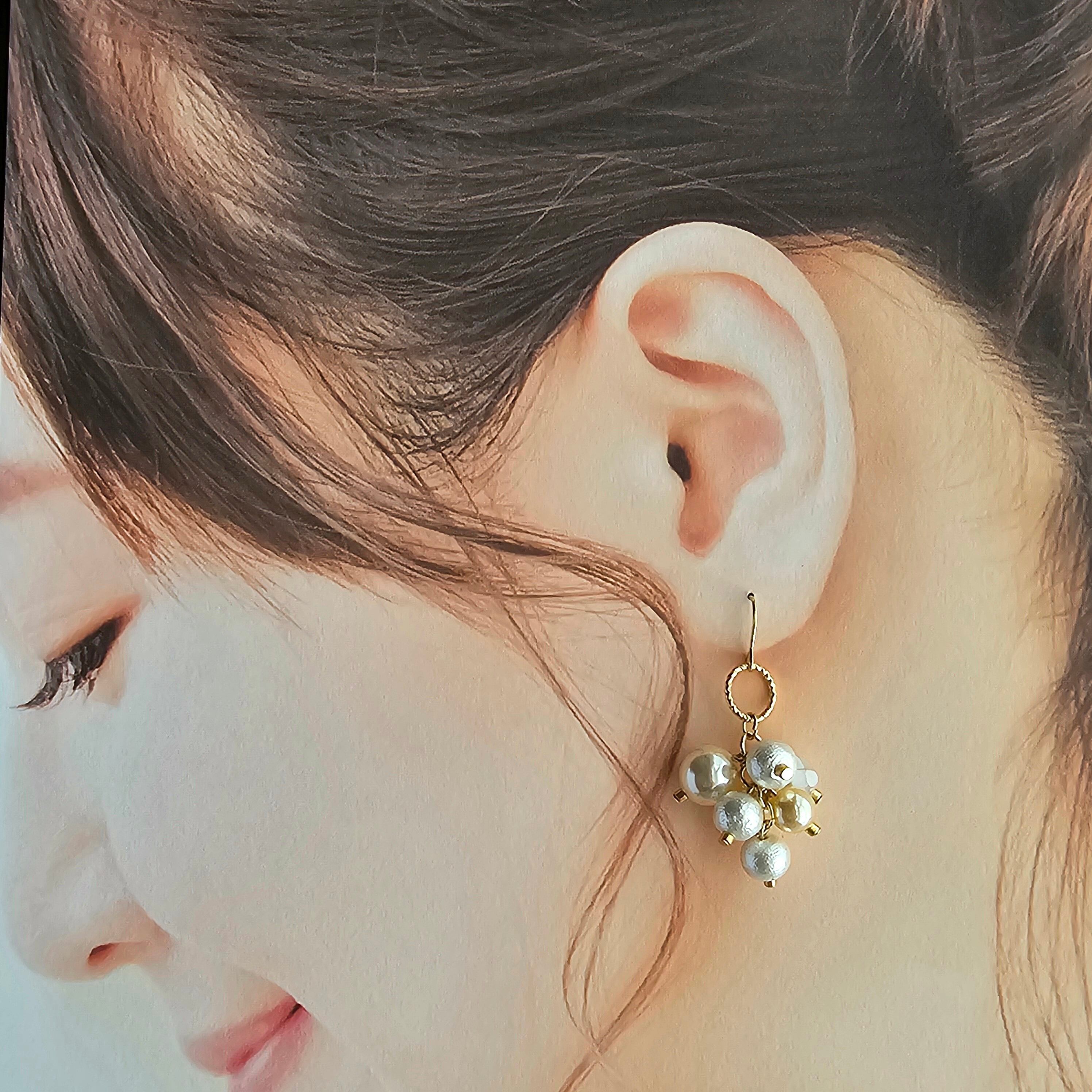ホワイト系、シャンパンゴールド系の色味を使用しているため、レフ板のように顔色を良くみせるアクセサリーです。