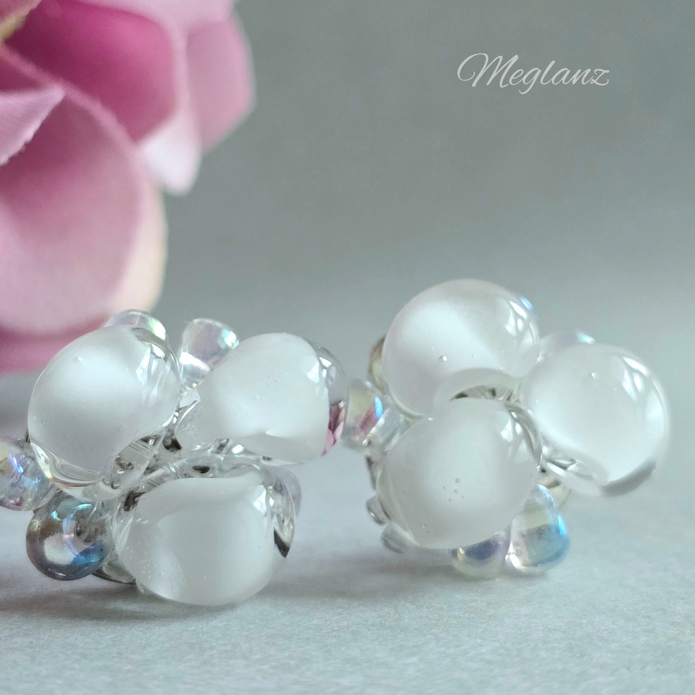 つるっとしたクリア×ホワイトのガラスビーズを使い、まが玉のクリアパーツと丸小パーツで隙間なく詰め込みました。